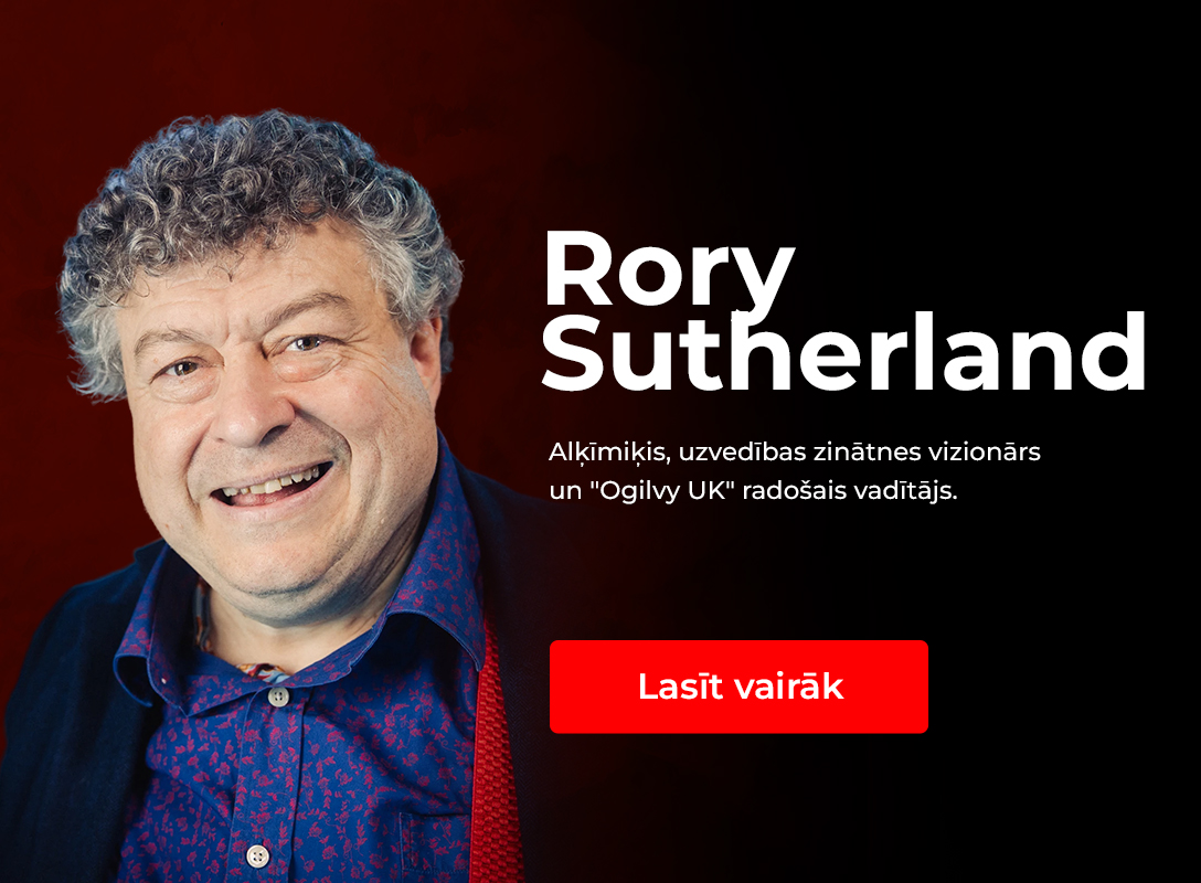 Rory Sutherland ir uzvedības zinātnes prakses pamatlicējs, bestsellera “Alchemy: The Surprising Power of Ideas That Don’t Quite Make Sense” un grāmatas “Transport for Humans” autors. Viņš ir kļuvis par “TikTok” fenomenu un visā pasaulē iedvesmo auditorijas ar sev vien raksturīgo, unikālo rokrakstu, asu humoru, drosmīgām atziņām un negaidītiem skatpunktiem.